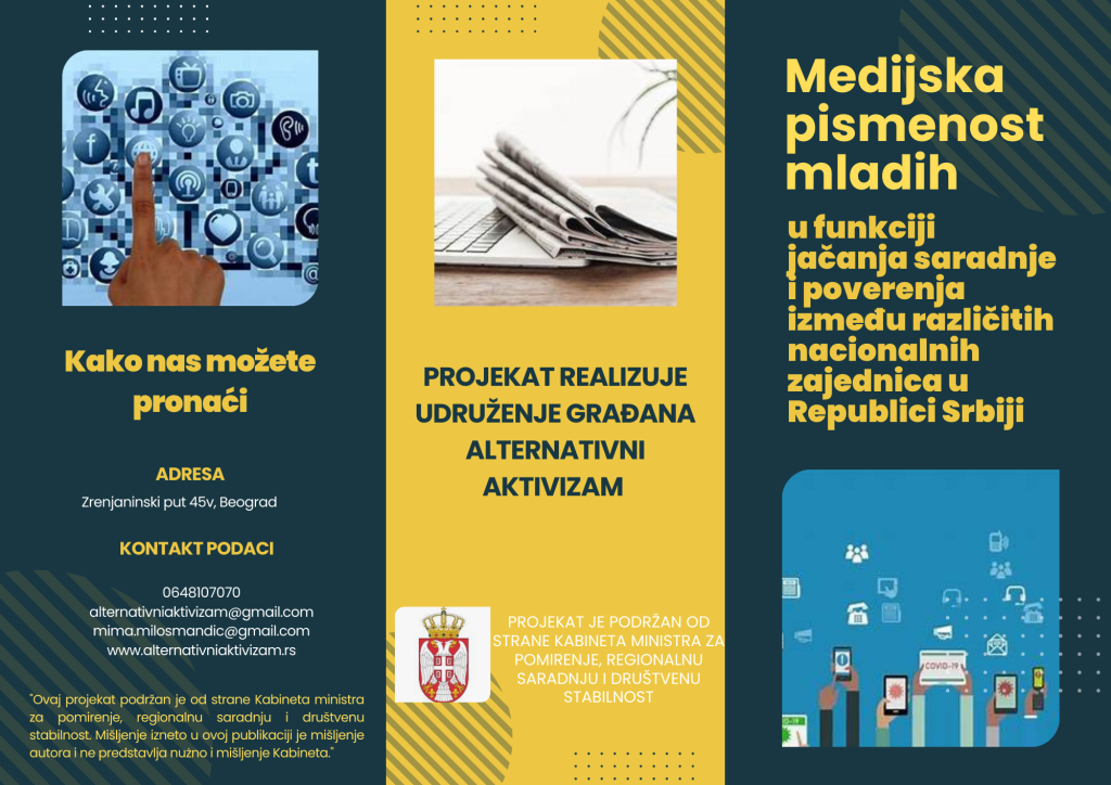 Početkom marta završeno je sa tromesečnom realizacijom projekta “Medijska pismenost mladih u funkciji jačanja saradnje i poverenja između različitih nacionalnih zajednica u Republici Srbiji”, koje je udruženje Alternativni aktivizam realizovalo zahvaljujući finansijskoj podršci Kabineta ministra za pomirenje, regionalnu saradnju i društvenu stabilnost, a u okviru Programa finansijske podrške merama i aktivnostima u oblasti pomirenja.